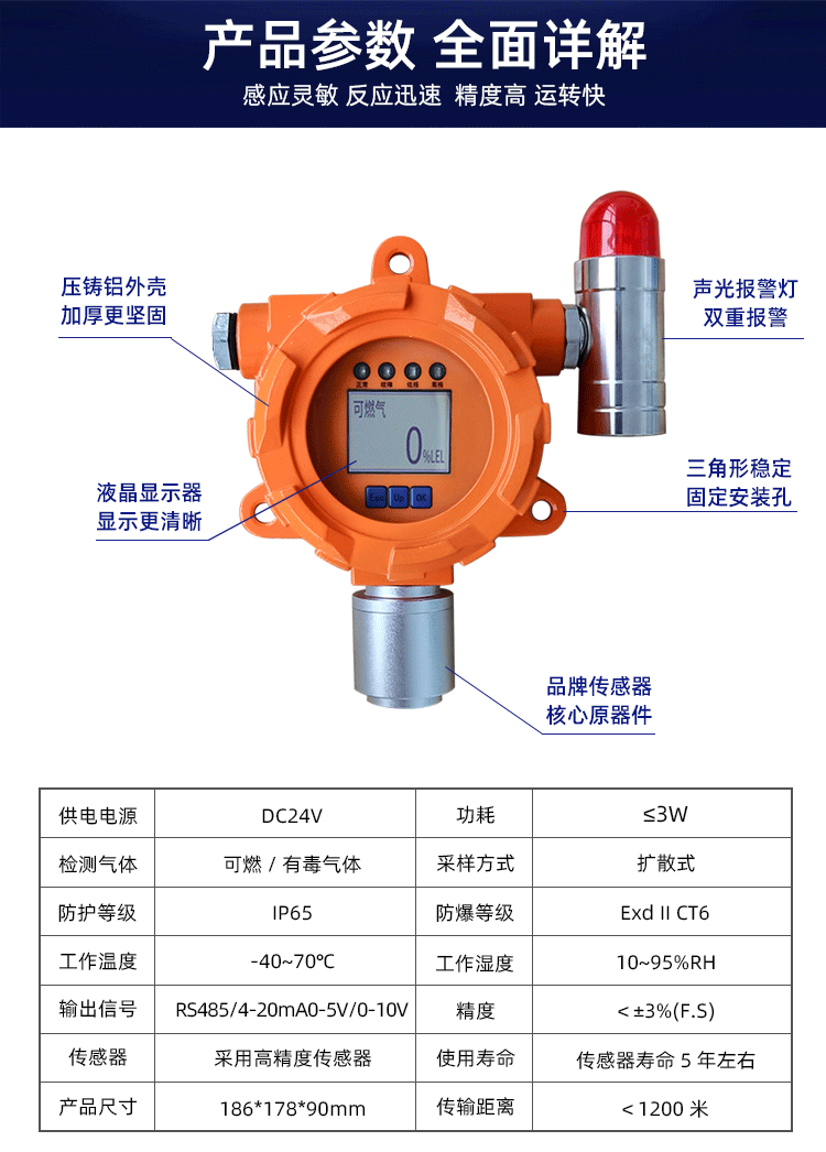 可燃氣探測器運行穩定可靠、安裝維護方便、測量氣體種類齊全,可滿足工業現場安全監測對設備高可靠性穩定運行和測量氣體種類多樣化的要求;已廣泛應用于石油、化工、冶金、煉化、燃氣輸配、生化醫藥及水處理等行業。